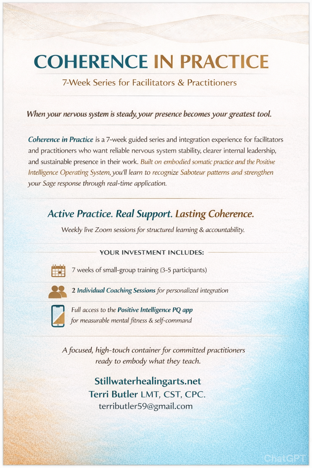 Coherence in Practice is a 7-week guided series and integration experience for facilitators and practitioners who want reliable nervous system stability, clearer internal leadership, and sustainable presence in their work. Built on embodied somatic practice and the Positive Intelligence Operating System, you'll learn to recognize Saboteur patterns and strengthen your Sage response through real-time application.